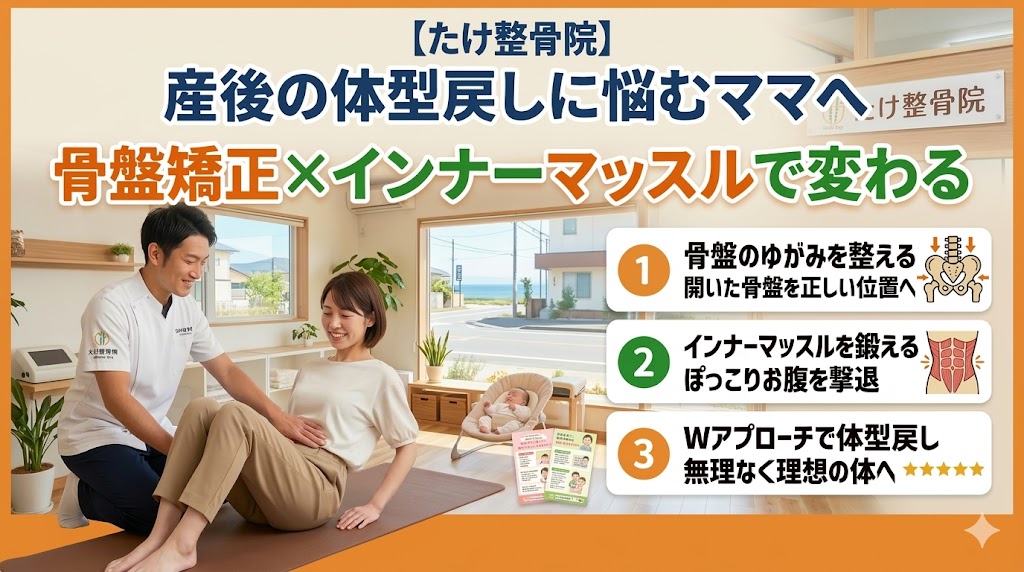 このページでは、産後の体型戻しに骨盤矯正×インナーマッスルケアが効果的な理由と、たけ整骨院のプログラムについて詳しくお伝えします。