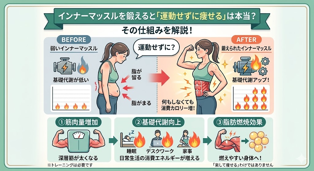 インナーマッスルを鍛えると「運動せずに痩せる」は、正確には「激しい運動をしなくても基礎代謝が上がり、痩せやすい体になる」ということです。