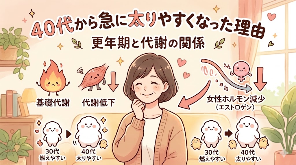 40代以降に起こるこの変化には、更年期によるホルモンバランスの乱れと、それに伴う代謝の低下が深く関わっています。「意志が弱いから」「食べすぎだから」ではなく、体の中で起きている生理的な変化が原因です。